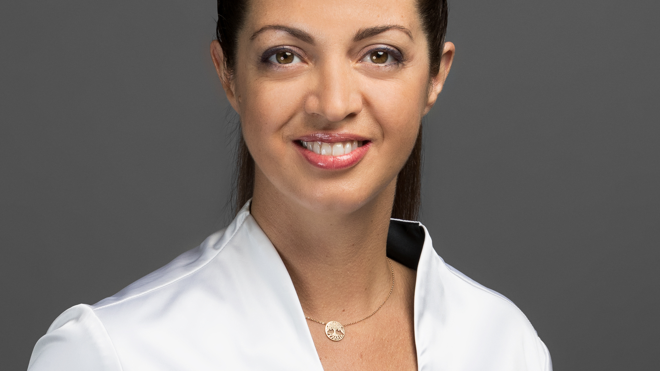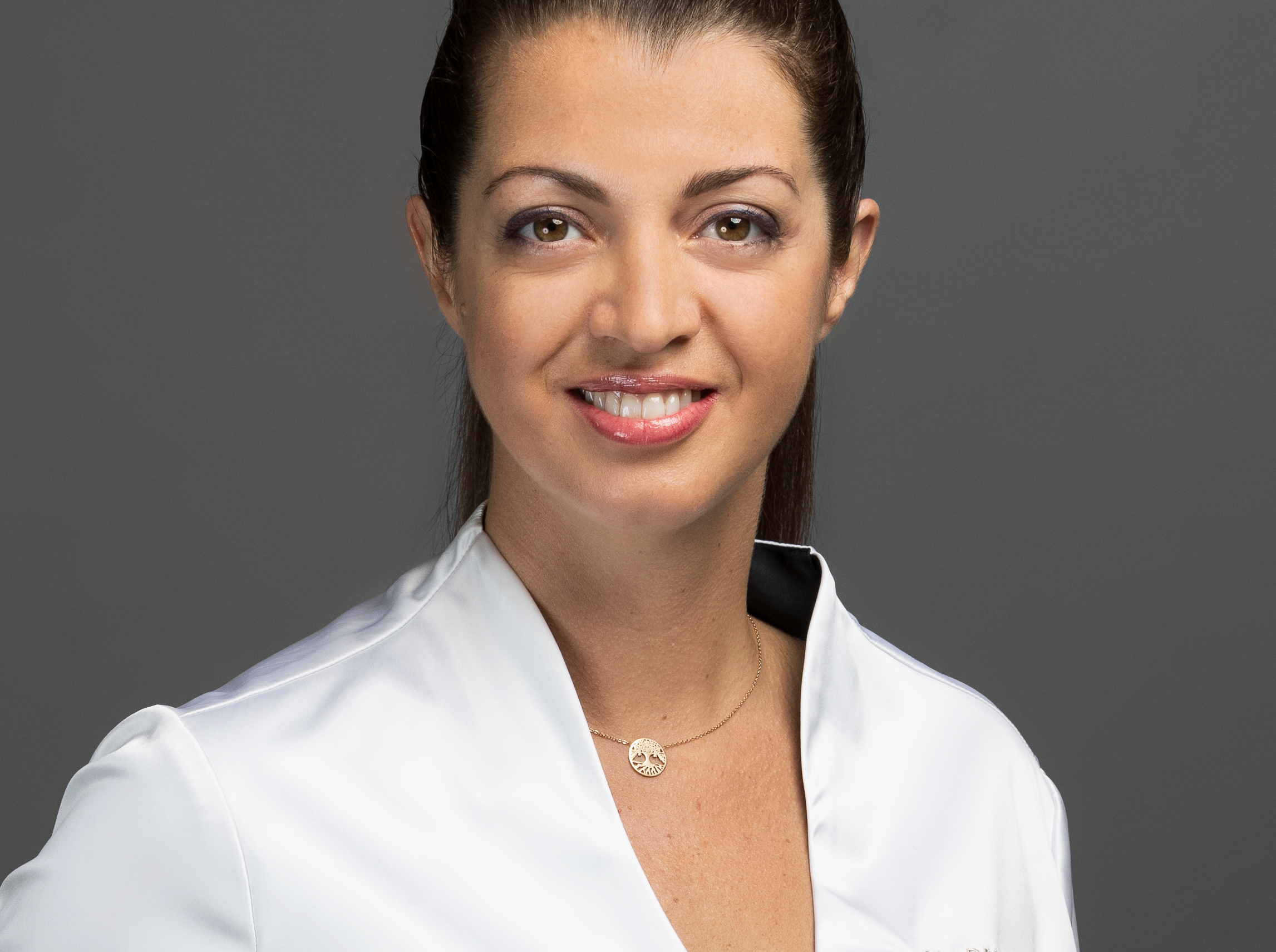 Portrait de l'experte soin DESSANGE, sur fond uni gris, illustrant le massage drainant remodelant brésilien et l’expertise bien-être.